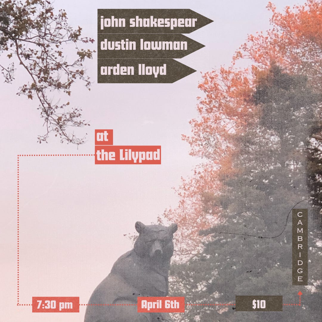 The thing about playing music is that ultimately, it is something I cannot and do not wish to stop doing. So, on April 6th, I’m coming back to The Lilypad in Cambridge, MA to play with two very talented songwriters, Arden Lloyd and Dustin Lowman. Here’s a photograph of a bear that conveniently includes information about the show: